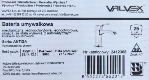 W komplecie: bateria, wężyki, zestaw montażowy, korek klik