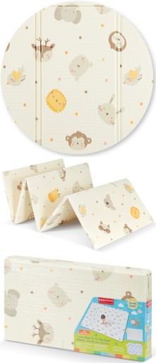 Na macie widnieją urocze, kolorowe zwierzątka z jasnym beżowym zachęcającym do zabawy tłem. Zwierzątka mają uśmiechniętą minę, co dodaje przyjaznego charakteru. Tło jest pełne jasnych kolorów, co sprawia, że mata jest atrakcyjna i stymuluje rozwój wizualny maluchów.