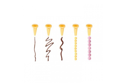 Dekorator wyposażono w aż 5 wymiennych końcówek, które pozwolą Ci na stworzenie dowolnego wzoru o różnej grubości i teksturze. Od cienkich, finezyjnych linii po grube, wyraziste elementy. Używa się go tak jak prawdziwego pisaka, dlatego zdobienie wypieków odbywa się z zachowaniem płynnych i pewnych ruchów, przekładających się na znakomite efekty.