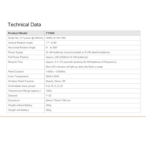 System radiowy XDzięki wbudowanemu odbiornikowy Systemu X, lampą TT600 można sterować za pomocą nadajników Godox 2.4G. Dodatkowo, dzięki zastosowaniu opcjonalnego nadajnika, TT600 może uzyskać tryb synchronizacji HSS. Na obudowie lampy znajduje się także gniazdo, w które można wpiąć odbiornik systemu 433MHz, aby sterować lampą za pomocą nadajników starszego typu.
