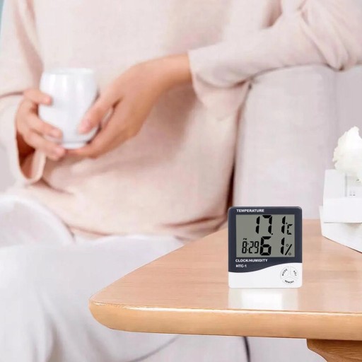 - Wyświetla jednocześnie temperaturę, wilgotność, godzinę
