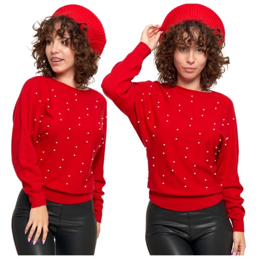 ELEGANCKI SWETEREK DAMSKI Z PEREŁKAMI KIMONOWY RĘKAW MORAJ CZERWONY L/XL