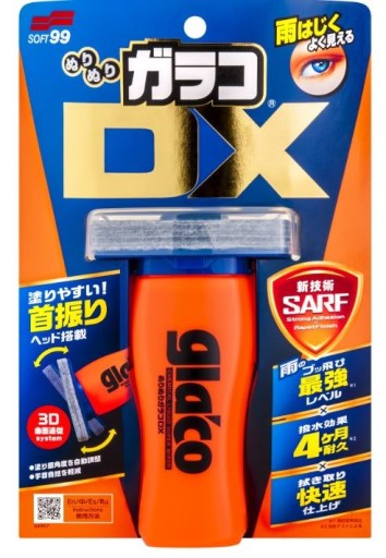 Soft99 Glaco DX Niewidzialna wycieraczka nowej generacji Najnowszej generacji niewidzialna wycieraczka z linii Glaco, która zapewnia niespotykaną dotąd, ekstremalną hydrofobowość, łatwość aplikacji i ergonomię pracy. Zapewnia to maksymalny poziom bezpieczeństwa w trakcie jazdy w deszczu i komfortu codziennego użytkowania auta, w jeszcze prostszy sposób. Glaco DX wykorzystuje nowo opracowaną technologię SARF (Strong Adhesion + Rapid Finish), dzięki której czas wiązania produktu z szybą został skrócony do zaledwie 5 minut, polerowanie pozostałości stało się bajecznie proste, a siła wiązania gwarantuje trwałość aż do 4 miesięcy. Dodatkowo, powłoka tworzy niesamowicie gładką warstwę, który odpycha wodę z szyb z niezrównaną mocą i szybkością. Opakowanie ze zintegrowanym aplikatorem jest znakiem rozpoznawczym linii Glaco, ale w przypadku Glaco DX, aplikator jest ewolucją tego cenionego rozwiązania. Nowością jest ruchoma główka aplikatora, która dostosowuje się do kąta pochylenia szyby, dzięki czemu praca stanie się łatwiejsza i szybsza, niezależnie od rodzaju pojazdu, szyby i umiejscowienia sąsiednich elementów, jak np. boczne lusterka. Zmodyfikowany został także kształt roboczej części aplikatora tak, by z łatwością można było dotrzeć w narożniki szyb i dokładnie pokryć całą ich powierzchnię.