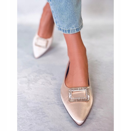Eleganckie baleriny damskie. Wysadzana błyszczącymi kamieniami klamerka przyciąga spojrzenia... Ponadto mają zgrabny fason z noskami w delikatny szpic oraz satynowe wykończenie. Można zakochać się w nich od pierwszego wejrzenia : ) Materiał - tkanina satynowa.