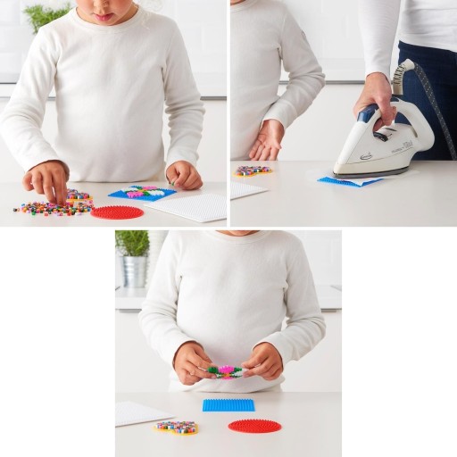 - kiedy już przygotujesz wybrany wzór połóż na koraliki papier dołączony do zestawu i prasuj go przez kilka sekund gorącym żelazkiem, tak by koraliki stopiły się i połączyły.