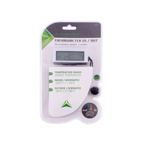 Elektroniczny termometr samochodowy z wyświetlaczem LCD. Umożliwia dokonywanie pomiaru temperatury zewnętrznej i wewnętrznej poprzez dwa niezależne czujniki temperatury. Zasilany z gniazda zapalniczki.
