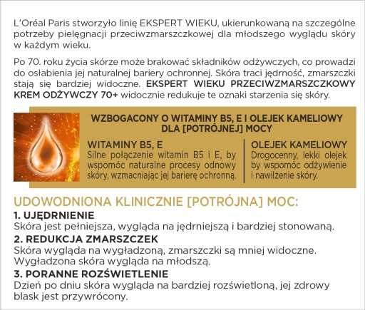 Po 70. roku życia skórze może brakować składników odżywczych, co prowadzi do osłabienia jej naturalnej bariery ochronnej. Skóra traci jędrność, zmarszczki stają się bardziej widoczne. Ekspert Wieku Przeciwzmarszczkowy krem odżywczy na noc 70+ widocznie redukuje te oznaki starzenia się skóry.