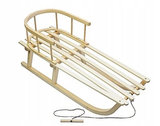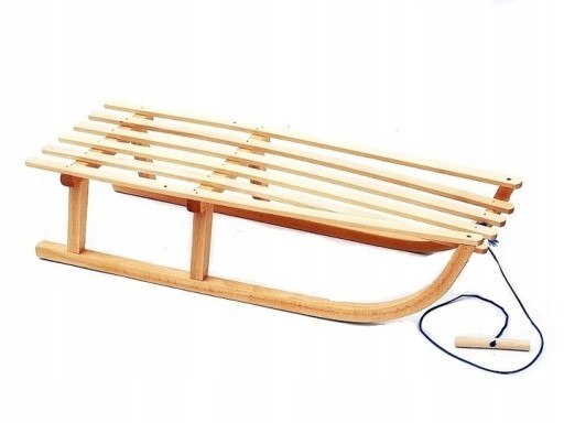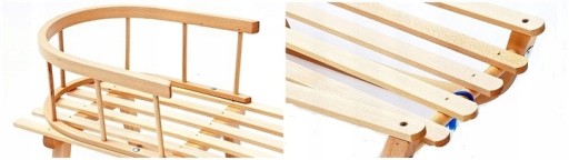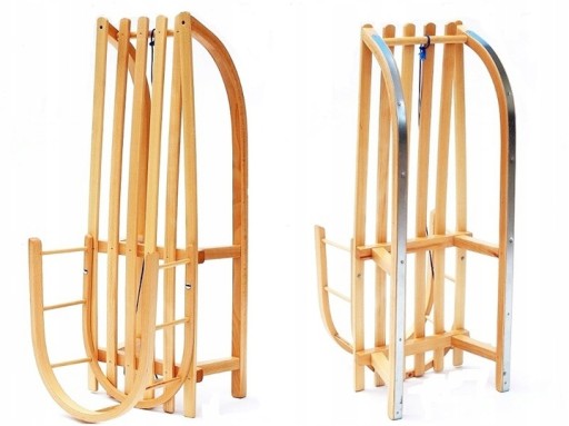 - Sanki wykonane z drewna bukowego, malowane ręcznie i podbite metalowymi płozami.