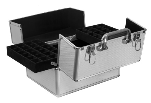 Wygodny i funkcjonalny kuferek dla stylistek paznokci. Idealnie sprawdza się w pracy mobilnych kosmetyczek. Posiada wygodne, wyjmowane przegródki na lakiery hybrydowe. Pojemny, pomieści 48 lakierów, których pionowe umieszczanie, zapobiega ich rozlaniu. Kuferek zamykany jest na kluczyk. Posiada ładne wykonanie, wykończony jest srebrnym okuciem, w środku wyłożony jest aksamitem. W jego dolnej części można przechowywać lampę UV, niewielką frezarkę lub inne przybory. Nadaje się również do użytku domowego. Umożliwia zachowanie porządku w kosmetykach i akcesoriach. Idealny na prezent. Kuferek mamy dostępny w kolorze : różowy, srebrny, czarny