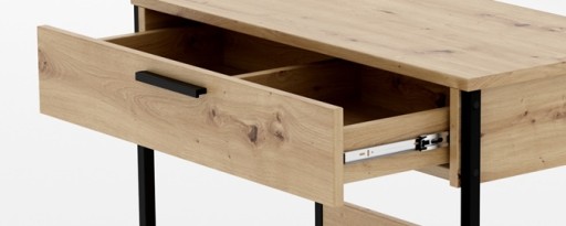 Za industrialny styl mebla odpowiada połączenie dekoru w kolorze drewna (dąb artisan) i czarnych nóżek.