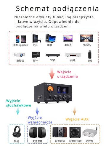 Wejście sygnału: RADIO BT AUX COAX OPT USB TF
