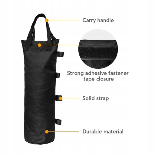 • Wykonane z tkaniny oxford 600D, wytrzymałej na rozdarcie i ścieranie. Przeznaczony do trzymania namiotu, parasola i innych mebli ogrodowych w miejscu.