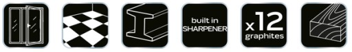 Ołówek stolarsko-murarski z temperówką oferowany jest w zestawie z 12 grafitowymi wkładami w trzech kolorach: