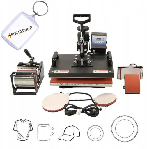Prasa termotransferowa wielofunkcyjna 5w1. Uniwersalne narzędzie do wykonywania nadruków termotransferowych. Prasa posiada wymienne końcówki grzewcze: