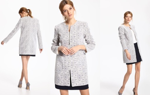 Stylowy płaszcz damski o prostym fasonie. Płaszcz zapinany na suwak. Idealny na co dzień, świetnie się sprawdzi jako uzupełnienie wiosennej lub jesiennej stylizacji. Płaszcz dostępny w kolorze białym z atłasowymi szarymi kwiatami. Modelka ma 176 cm wzrostu i prezentuje rozmiar 34.
