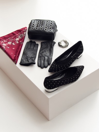Wygodne baletki damskie wykonane z materiału imitującego zamsz. Stylowe baleriny z noskami w szpic i ozdobnymi kuleczkami na całości. Idealne na co dzień buty dostępne w kolorze czarnym.