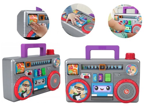 Dzięki edukacyjnym wypowiedziom i piosenkom magnetofon pomaga w nauce literek, liczenia, kolorów i nie tylko, gdy dziecko przesuwa tuner, naciska przełączniki lub otwiera i zamyka otwór na kasety.