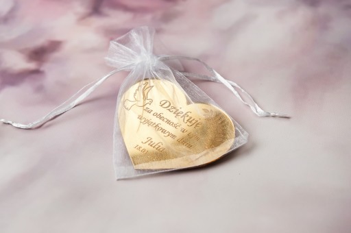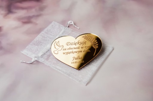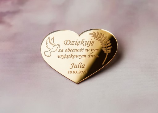 Magnesy to piękna i oryginalna pamiątka oraz podziękowanie dla gości za udział w uroczystości. Produkt wykonany jest metodą cięcia laserowego ze złotego lustra. Każda sztuka jest grawerowana, dla tego podczas składania zamówienia należy podać: IMIĘ oraz DATĘ.