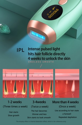 Depilator IPL wykorzystuje profesjonalną technologię IPL (Intense Pulsed Light), która może oddziaływać bezpośrednio na cebulkę włosa (brak interferencyjnego źródła światła). Działa poprzez ogrzewanie mieszków włosowych, skupia energię świetlną u nasady, absorbuje melaninę i hamuje wzrost włosów.