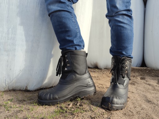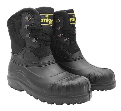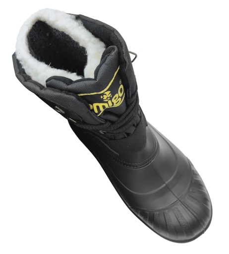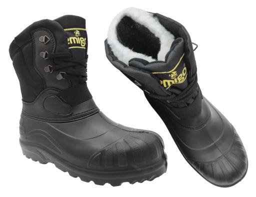 KALOSZE MĘSKIE ŚNIEGOWCE PIONIER 908/ LEMIGO. Rewelacyjne obuwie ocieplane, lekkie, komfortowe i bardzo wygodne w użytkowaniu. Występuje w kolorze czarnym. Rozmiar: 40 - 47. Model z wysoką cholewką, zakończony miękkim kołnierzem, posiada wszyty język, wymienny ocieplacz wykonany z folii aluminiowej, włókniny filcowej i kołnierza kożuchowego, dopasowanie za pomocą ściągania sznurówkami. Para waży ok.900g. Kalosze zaprojektowane w designie solidnego trapera. Wykonane z jakościowego materiału EVA + poliester w części cholewki. Obuwie jest lżejsze od produktów z gumy lub PVC. Główną zaletą obuwia z EVA jest twardość i elastyczność dzięki składnikom zawartym w mieszance chemicznej. To materiał odporny na zniekształcenia, rozrywanie i szkodliwe działanie promieni słonecznych. Swoje elastyczne właściwości zachowuje nawet w bardzo niskich temperaturach - 30°C. Wysoki stopień izolacji termicznej tego obuwia gwarantuje bardzo duży komfort użytkowania. Podeszwa o właściwościach przeciwpoślizgowych zapewnia stabilność. Solidność w połączeniu z wygodą i doskonałą termoizolacją, sprawiają że po te kalosze chętnie sięgają myśliwi, wędkarze oraz wszyscy, którzy stawiają na jakość i komfort, zwłaszcza w zmiennych warunkach pogodowych.