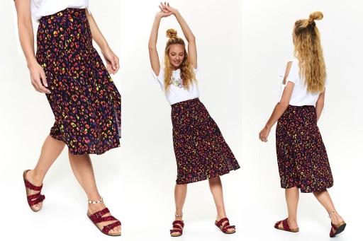 Lekka spódnica wykonana z przewiewnej tkaniny z kolorową panterkę. Spódnica o długości midi, z przodu zapinana na guziki, doskonale sprawdzi się na co dzień, jest dostępna w kolorze czarnym.