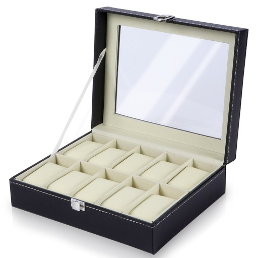- POJEMNE - Posiada 10 oddzielnych miejsc do przechowywania zegarków. Każdy zegarek będzie miał swoje miejsce, pięknie eksponując się na jasnym tle.
