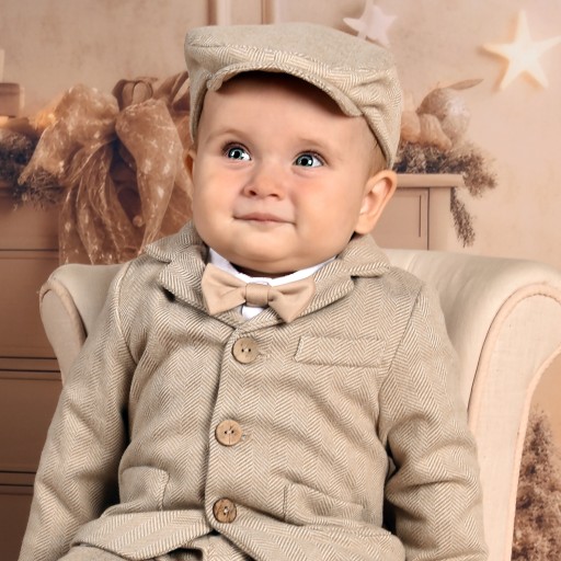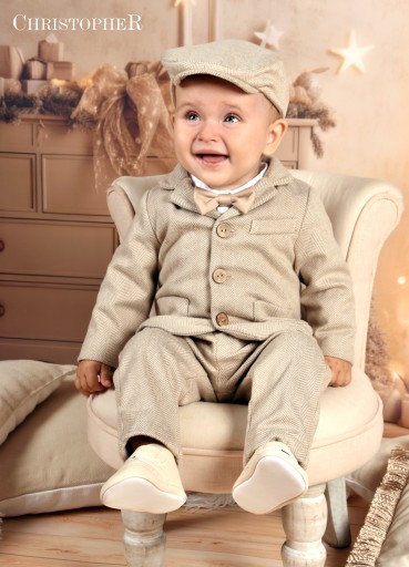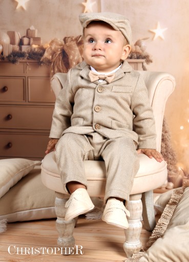 Garnitur chłopięcy na wykonany z najwyższej jakości materiałów przyjaznych dziecku. Tkanina w jodełkę. Garnitur miły i ciepły składa się z kilku elementów: