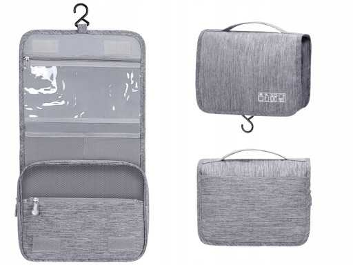 Posiada haczyk, dzięki któremu rozwiniętą kosmetyczkę można powiesić na łazience lub na drzwiach.