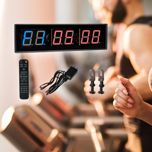 Duży wyświetlacz LED o przekątnej 2,3 cala: Ten timer interwałowy składa się z dwóch niebieskich cyfr i czterech czerwonych cyfr. Dzięki jasnej diodzie LED o przekątnej 2,3 cala z pięcioma poziomami regulacji jasności możesz wyraźnie zobaczyć godzinę na ścianie w garażach lub siłowni.