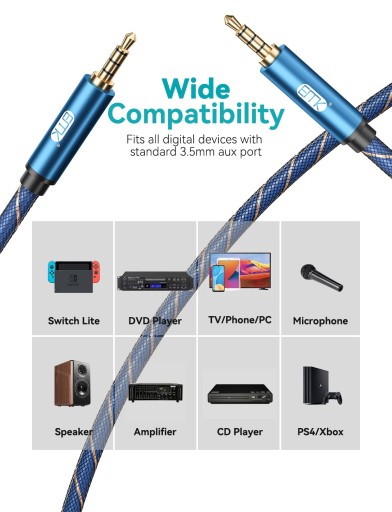 - 【Szeroka kompatybilność】 4-biegunowy kabel aux nadaje się do laptopów, cyfrowych odtwarzaczy muzycznych, tabletów, odtwarzaczy MP3, aparatów fotograficznych, laptopów, telewizorów i wszystkich innych urządzeń ze standardowym gniazdem 3,5 mm. Możesz cieszyć się muzyką wysokiej jakości w dowolnym miejscu, w samochodzie, w pokoju, w biurze.