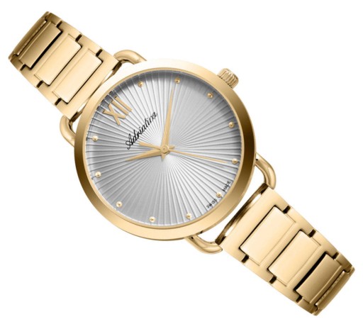 Damski elegancki klasyczny zegarek Adriatica A3729.1187Q. Stalowa pozłacana koperta i bransoleta w kolorze żółtego złota. Szara tarcza. Wskazówki w kolorze koperty. Klasa szczelności WR. Szwajcarski mechanizm Ronda