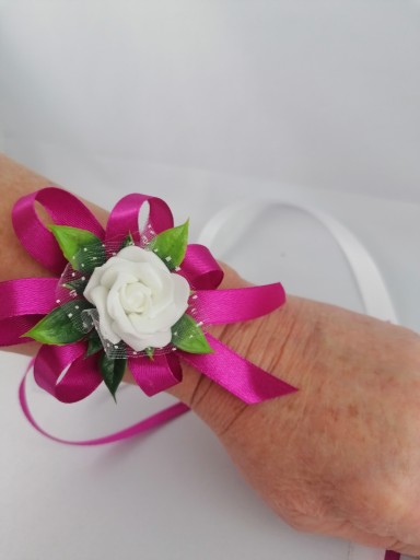 - kwiat w kolorze białym upięty na satynowych białych tasiemkach /12 i 6 mm fuksja , biała/