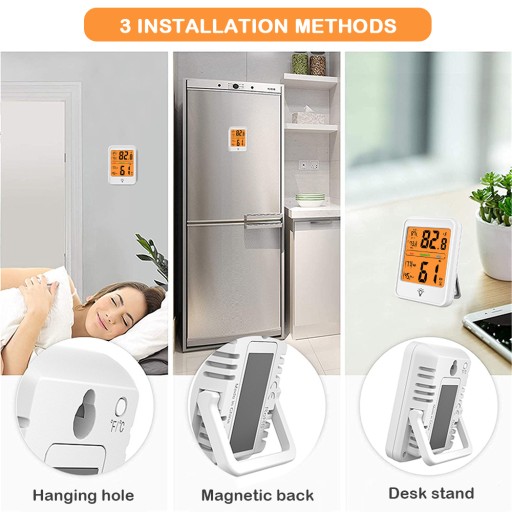 Stół / Magnetic Back / Hanging Hole - higromter stoi na własnej dłoni za pomocą flip - ukryty uchwyt z tyłu, i może być zamontowany na ścianie z małym brad / gwóźdź, lub inny go z magnesem. Można zamontować termometr ścienny gdziekolwiek chcesz, np. w sklepie, pokoju dziecka, kuchni, szklarni, pokoju gitarowym, piwnicy itp.