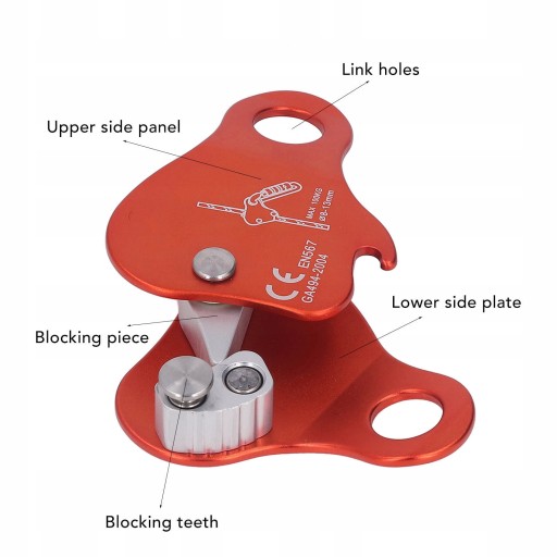 4. Konstrukcja elementu blokującego: Element blokujący zacisk liny wspinaczkowej i element blokujący współpracują ze sobą, aby złapać główną linę i odegrać efekt chwytania liny i zatrzymać ślizganie.