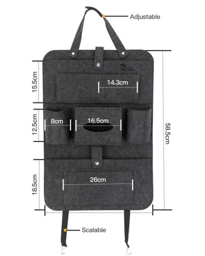 - Na górze filcowego organizera samochodowego znajduje się największa kieszeń, która dodatkowo zabezpieczona jest zapięciem na rzep. Można umieścić w niej np. książkę, czasopisma, tablet, kolorowanki lub pieluszki.