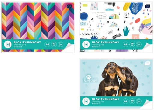 Blok rysunkowy, 20 kartek o gramaturze 80g. Całość na podkładzie z grubej tektury. Kolorowe okładki z kredy przyciągają uwagę dzieci.