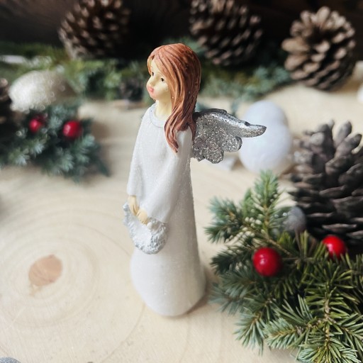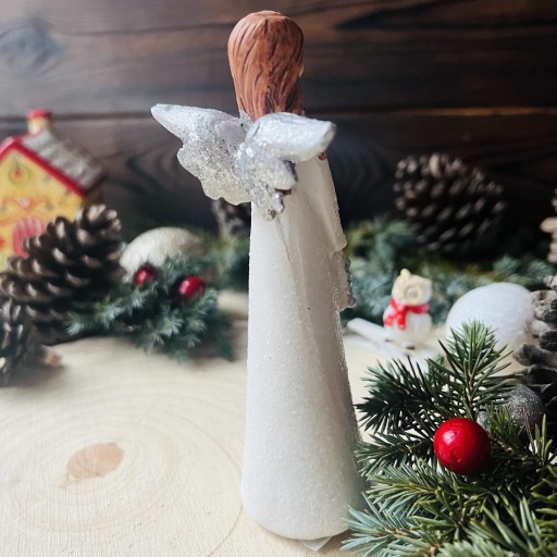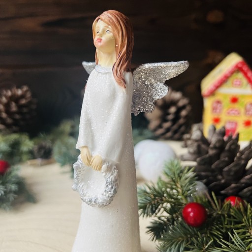 - Figurka Anioła z wianuszkiem w białej połyskującej sukience, która pięknie mieni się w świetle