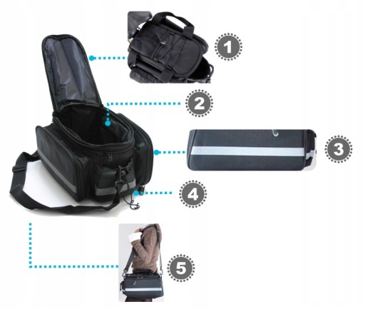 Sakwa wykonana z poliestru o nieprzemakalnym wykończeniu - Waterproof Design. Możliwość zwiększenia objętości głównej komory. Odblaskowe elementy z tyłu i po bokach dla lepszej widoczności i bezpieczeństwa. Gumka kompensacyjna na górnej pokrywie. Wewnętrzne kieszenie na drobiazgi. Pasek na ramię w komplecie. Wysokiej jakości wykończenie wnętrza. Trzy zewnętrzne kieszenie boczne (z możliwością powiększenia).