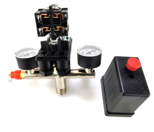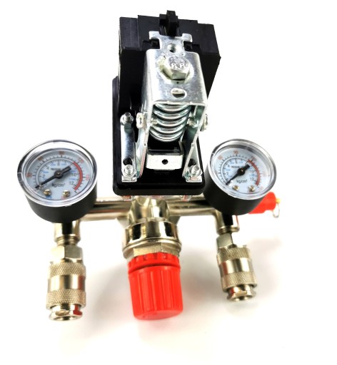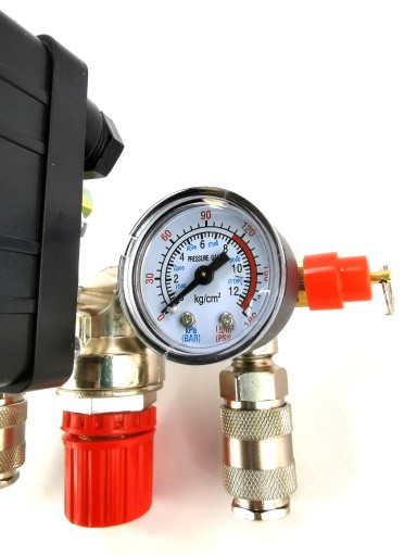Wysokiej jakości wyłącznik ciśnieniowy (presostat) z kolektorem, dwoma szybkozłączkami i manometrami przeznaczony do kompresorów ciśnieniowych na 230V. Presostat wykorzystywany jest głównie w kompresorach o pojemności 24l, 50l, 60l, 100l, 150l