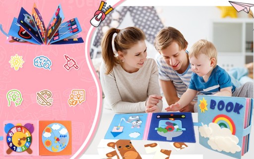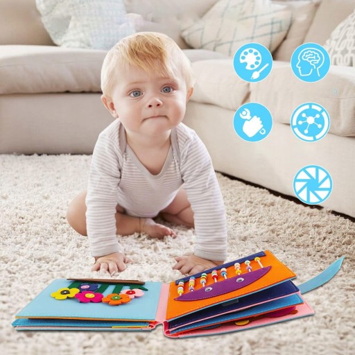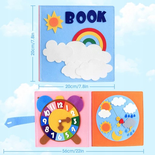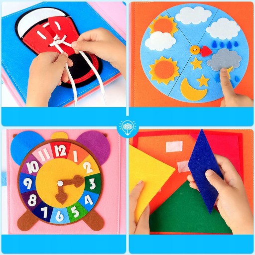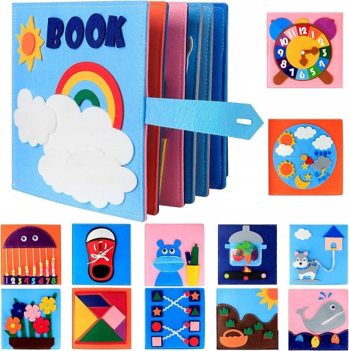 - 🌈 Filcowa książeczka dla maluchów zawiera różnorodne aktywności, takie jak kręcenie rękami, wiązanie sznurowadeł, zegarki, pogoda, hipopotam myjący zęby, płytki naciskowe, kolorowe puzzle, dopasowywanie gier, ciągnięcie rzodkiewki, naklejki sensoryczne itp.