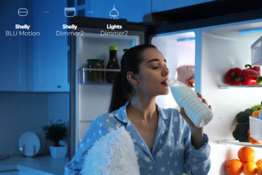 Unikaj ostrego oświetlenia podczas nocnych wizyt w celu przekąsek lub toalety. Użyj Shelly BLU Motion razem z Shelly Dimmer i spraw, aby światła włączały się przyćmione po określonej godzinie. Dzięki temu nie podrażnisz oczu i nie obudzisz bliskich.