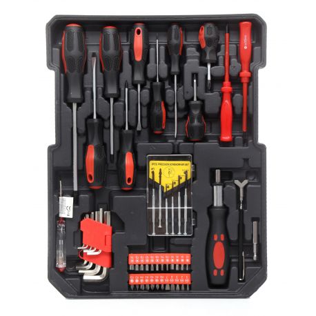 Zestaw obejmuje: klucze płaskie, nasadowe, grzechotkę, młotek, zestaw szczypiec, poziomice, zaciski, taśmę mierniczą, taśmę izolacyjną, nóż, komplet gwoździ i wkrętów, a także wkrętaki i końcówki do bitów.