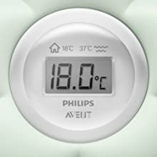 Dzięki termometrowi łazienkowemu SCH480/00 firmy Philips Avent zawsze masz pod uwagę temperaturę dobrego samopoczucia dziecka. Za pomocą termometru należy sprawdzić, czy temperatura wody w kąpieli wynosi od 36,5 °C do 38 °C. Pomóż dziecku w zdrowy i delikatny sen, obniżając temperaturę pokojową ok. 18°C. Dokładny wyświetlacz cyfrowy jest ustawiony w pozycji pionowej, dzięki czemu jest przejrzysty i łatwy do odczytania. Termometr do łazienki i sypialni jest całkowicie wodoszczelny i unosi się na wodzie.