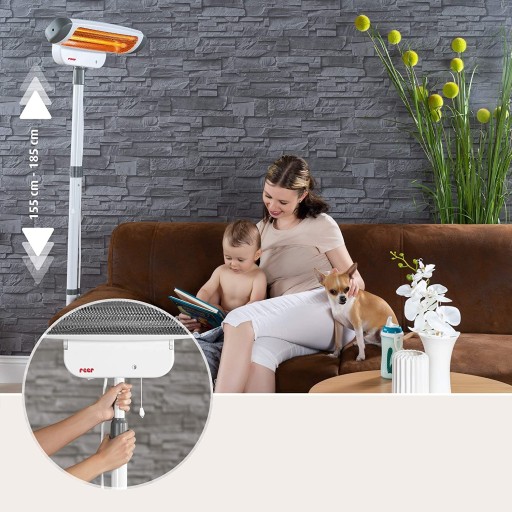 Ten model promienników ciepła FeelWell firmy Reer jest wyposażony w podstawę i drążek teleskopowy. Promiennik można umieścić w dowolnym miejscu w pomieszczeniu, możliwy jest również montaż na ścianie. Bezpieczeństwo zapewnia wyłączenie przy przechyleniu grzejnika: jeśli grzejnik obraca się o więcej niż 25°, grzejnik automatycznie wyłącza lampy cieplne.
