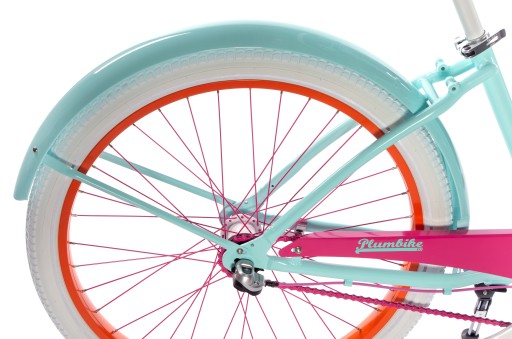 - Wykorzystane kolory - miętowy, różowy, pomarańczowy, biały. Opony w kolorze białym, chwyty i siodło w kolorze białym.
