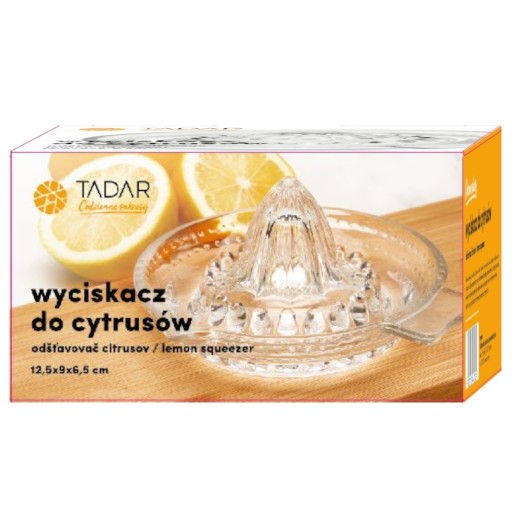 Wyciskarka do cytrusów Tadar 14 x 13,5 x 6,5 cm jest w całości szklany. Pomieści sok z pomarańczy lub cytryn, zanim trzeba go będzie opróżnić. Cała budowa produktu jest poręczna i bezpieczna dla żywności. Z jego pomocą włożysz niewiele wysiłku w wyciskanie cytrusów. Wyciśnięty sok wygodnie zbierzesz, dlatego w razie potrzeby dodasz go. Pestki i miąższ bez trudu oddzielisz od świeżego soku. Wygodnie opróżnisz szklany pojemnik z soku oraz zrobisz domową lemoniadę. Produkt łatwo przechować i można go myć w zmywarce.