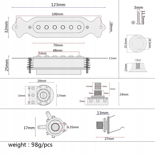 All-in-one, wstępnie okablowane 6-strunowe uprząż do przetwornika gitary elektrycznej