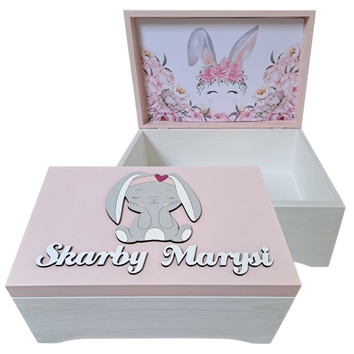 Elementem dekoracyjnym jest namalowany przez naszych plastyków króliczek oraz napis Skarby Marysi. Oczywiście w tym miejscu napiszemy każde wskazane w uwagach przez Ciebie imię.