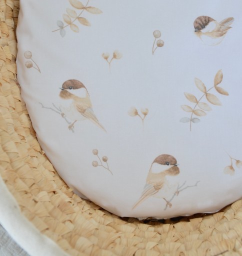 Wzór: wróbelki i gałązki na białym tle (100% bawełna).