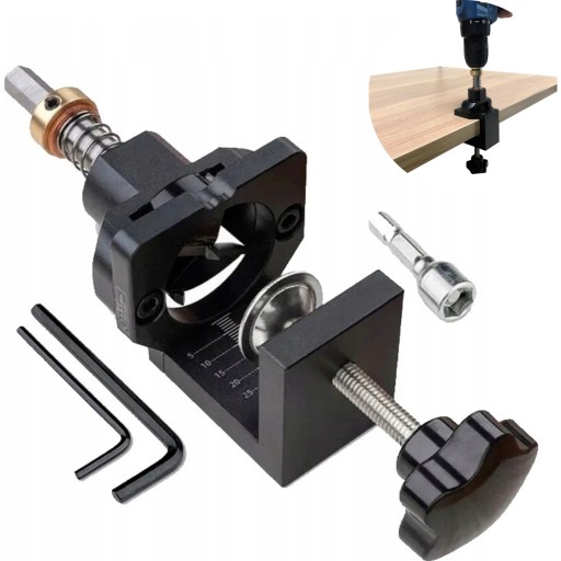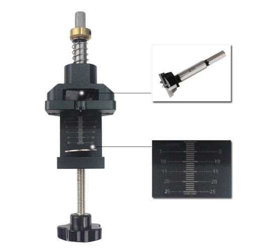 Prowadnica do wiercenia otworów pod zawiasy z urządzeniem zaciskowym do pozycjonowania osi, regulacji położenia marginesu i łatwej obsługi
